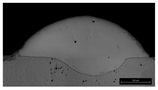 Figure 5 shows a cross-sectional image of a single track cladded using experimental setup 1 and 2400 W laser power, 24 g/min powder feed rate, and 2 m/min scan velocity. Spherical pores with a maximum diameter of 25 µm have been detected within the deposition track. In relation to the dimensions of the track, these pores are negligible and indicate a qualitative coating. Additionally, the track geometry remains constant throughout the whole length of the track, as also observed for the other applied parameters.
