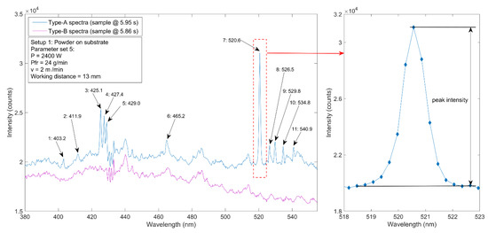 Even though a larger wavelength range from 200 to 800 nm was considered during spectroscopic measurements, the most significant peaks were observed in a comparatively small range from 400 to 540 nm. Moreover, such peaks were not detected permanently in every single spectrum that was taken (compare definition of spectra types A and B in Section 2). An example of a well-evaluable spectrum of type A including the identification of significant spectral lines is shown in Figure 6. A type B spectrum is shown as well.