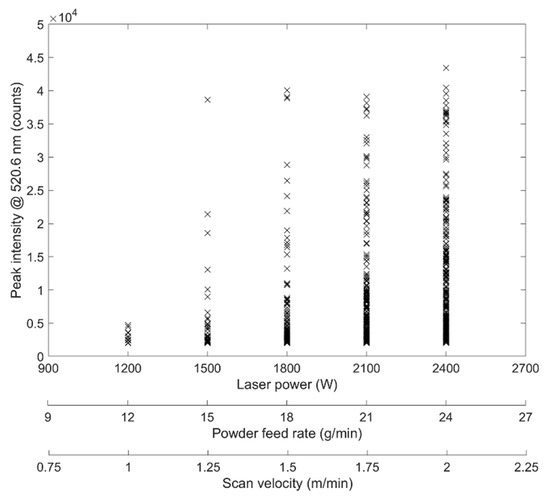 In order to gain information on the impact of applied laser process parameters on the formation and radiance of spectra, the intensities of a selected peak—the most intense one at a wavelength of 520.6 nm—was plotted as a function of laser power, powder feed rate, and scan velocity, respectively. This peak was chosen since it is composed of three different Cr I transitions as mentioned above and listed in Table 3. These transitions feature a very high intensity [34]; thus, the signal is prominent and easy to detect. In Figure 7, the peak intensities for each type A spectra are shown.