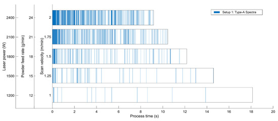 Incidence of detected type A spectra for setup 1 vs. process time; each blue line represents a type A spectrum whereas for the white ranges, merely type B spectra occurred. Note that the process time decreases with increasing scan velocity, since the process parameters were adapted to obtain a constant linear energy and linear mass as described in Section 2.