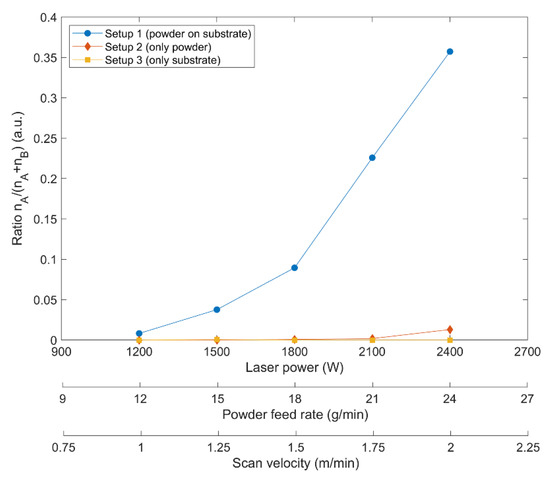 This assumption is also supported when comparing the particular ratio of type A spectra for the three investigated experimental settings visualised in Figure 3. This ratio, given by the quotient of the number of type A spectra nA with respect to the total number of spectra nA + nB and thus the incidence of detected type A spectra, drastically increases with increasing laser power, powder feed rate, and scan velocity in the case of setup 1, as shown in Figure 9.