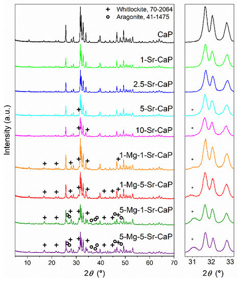 Aina et al. [20] synthesized magnesium- and strontium-co-substituted hydroxyapatite by an aqueous precipitation method. They obtained biphasic calcium phosphates (BCPs) with variable HAp/β-tricalcium phosphate (β-Ca3(PO4)2, β-TCP) ratios. Geng et al. [21] synthesized a series of Sr/Mg-co-substituted HAp-s by a hydrothermal method. The in vitro results showed that the co-addition can result in both, increased and decreased cell proliferation and bioactivity, as compared to HAp, depending on the ion concentration [21].