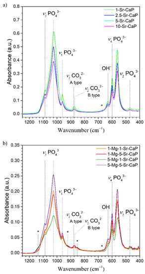 FTIR spectra of Sr-substituted (a) and Mg- and Sr-co-substituted (b) samples over the spectral range from 1250 to 400 cm−1. Appearance of low-intensity vibrational bands characteristic for whitlockite are marked with * and ″.