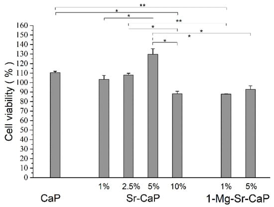 The results of the MTT test are presented in Figure 4 as a percentage of viable Hek293 human embryonic kidney cells treated with sample extracts for 72 h. As shown before, an uncomplete hydrothermal conversion of aragonite was obtained in the Mg- and Sr-co-substituted scaffolds 5-Mg-1-Sr-CaP and 5-Mg-5-Sr-Ca and these samples were omitted in the cytotoxicity evaluation.