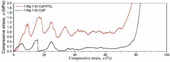 To investigate the influence of PCL impregnation on the mechanical properties of porous CaP scaffolds compression tests were performed on CaP/PCL, 1-Mg-CaP/PCL, 1-Mg-1-Sr-CaP/PCL and 1-Mg-5-Sr-CaP/PCL composite specimens. For comparison, the corresponding uncoated CaP, 1-Mg-CaP, 1-Mg-1-Sr-CaP and 1-Mg-5-Sr-CaP scaffolds were tested as well. Typical compressive stress–strain curves for coated and uncoated specimens are shown in Figure 6.