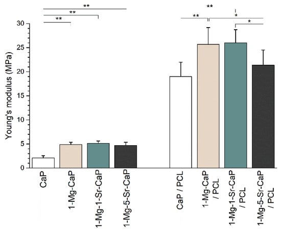 Young’s modulus of unsubstituted (CaP), ion substituted uncoated scaffolds (1-Mg-CaP, 1-Mg-1-Sr-CaP and 1-Mg-5-Sr-CaP) and corresponding coated scaffolds (1-Mg-CaP/PCL, 1-Mg-1-Sr-CaP/PCL and 1-Mg-5-Sr-CaP/PCL). At least nine replicas of each scaffold were tested and deviations are presented with error bars. The significant difference between two groups: * p < 0.05; ** p < 0.01.