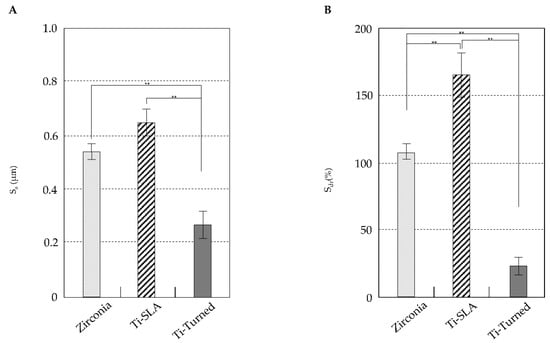 The data of roughness parameters (Sa, Sdr) of the groups. (A) The surfaces of the Ti-SLA and zirconia implants were significantly rougher than that of Ti-turned implants based on the Sa value (p < 0.01). Although the Sa value seemed to be higher for the Ti-SLA implants than zirconia implants, the difference was not statistically significant (p = 0.084). (B) The mean Sdr values showed that Ti-SLA was the highest, followed by zirconia and Ti-turned surfaces. The mean Sdr value for one surface was significantly different from that for another (p < 0.05). Error bars represent the standard deviation. (**) represents the significance, ** p < 0.05.