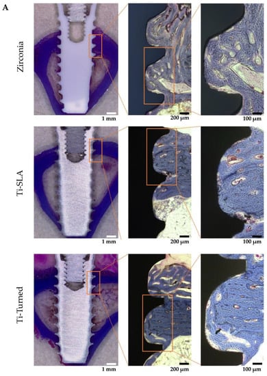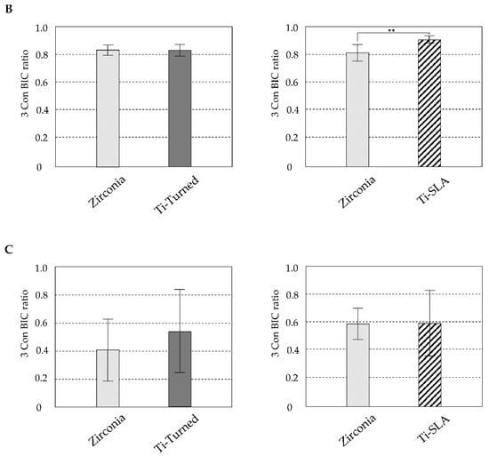 The mature bone and newly formed bone might be distinguished by the Masson’s trichrome staining method [25]. In the cortical area, where the neck and apex of the implants were placed, the existing mature bones were stained blue (Figure 3A). In the histological analysis of zirconia, Ti-turned, and Ti-SLA implants, bone formation was found in peri-implant areas. Highly dense bone was especially visible in the Ti-SLA implant, along the bone–implant interface. New immature bone was detected and stained red at the implant threads and around the mature bone (Figure 3A). The mean values and standard deviation (SD) for BIC (%) were 83.20 ± 4.06 for Ti-turned and 83.39 ± 3.52 for zirconia in the two experimental animals. Additionally, in the remaining animals, 90.52 ± 2.64 was found for Ti-SLA, and 81.19 ± 5.79 was found for zirconia for the mean values and SD of BIC (%) (Figure 3B). The mean values and SD for BA (%) were 53.22 ± 29.66 for Ti-turned and 40.58 ± 21.98 for zirconia, while those were 59.24 ± 23.20 for Ti-SLA and 58.85 ± 11.02 for zirconia (Figure 3C). The zirconia and Ti-SLA implants showed a significant difference in BIC (p = 0.012), but not in BA (p > 0.05). There were no significant differences between Ti-turned and zirconia implants in either BIC or BA (p > 0.05).