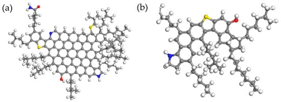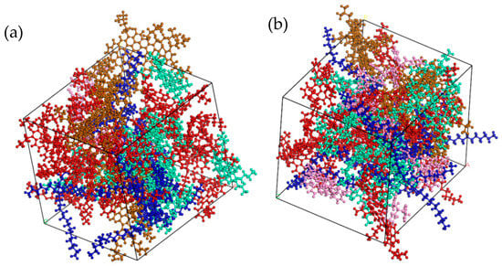 Two molecular models of modified asphalt: (a) PG76-22 modified asphalt (SBS modifier parameters 4.27%); (b) S-HV (SBS modifier parameters 11.8%).