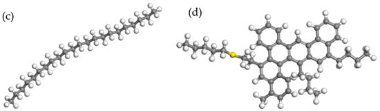 Three-dimensional structure diagram of the four components of asphalt: (a) asphaltenes; (b) resins; (c) saturates; and (d) aromatics. Note: white atoms = H, black atoms = C, yellow atoms = S, blue atoms = N, red atoms = O.