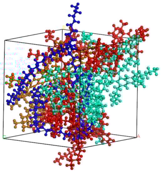 Asphalt has very complex chemical compositions with a variety of hydrocarbons and their non-metallic derivatives (a mixture of hydrocarbons and non-hydrocarbons). Therefore, it cannot be described as a single pure compound. In 1969, Corbett [28] developed a four-component analysis method to classify asphalt into saturates, aromatics, resins, and asphaltenes, which were widely applied in the design and micro-mechanism of asphalt materials on the molecular scale. Using this four-component asphalt model, researchers have evaluated the compatibility of asphalt and modifiers, the adhesion between asphalt and aggregate, and the effect of oxidative aging on asphalt binders [29,30,31,32]. In this research, a four-component asphalt model was established based on MS molecular dynamics software to perform simulation experiments, as shown in Figure 1.