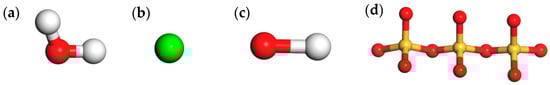 The molecular model of C-S-H gel components. (a) H2O molecular model; (b) Ca+ ion model; (c) OH− ion model; (d) Si3O10 molecular model.
