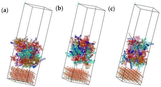 In order to study the adhesion properties of different types of asphalt components on C-S-H gel surface at different temperatures, interfacial molecular models were constructed for different asphalt types and C-S-H gel. The models had a three-layer structure with the lower layer being C-S-H gel mixture, the middle layer being asphalt mixture, and the upper layer being the 50 Å vacuum layer. Four temperatures of −15 °C, 25 °C, 65 °C, and 105 °C were simulated. The interface models, as shown in Figure 8, were named Model A (70#asphalt), Model B (PG76-22 modified Asphalt), and Model C (S-HV modified asphalt).