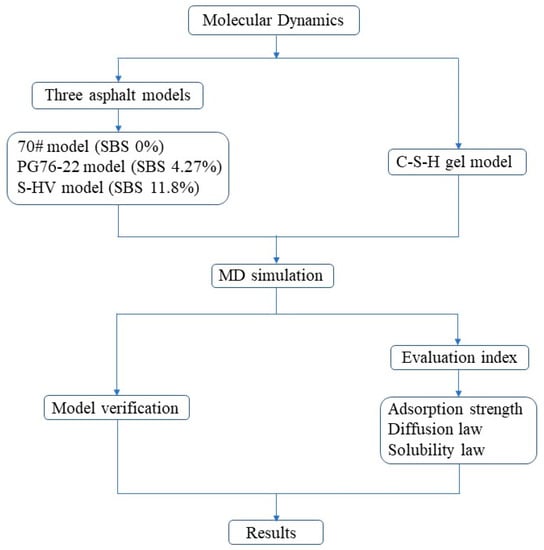 The research method and technical workflow of this paper are shown in Figure 9. Firstly, three asphalt models and the C-S-H gel model were established, and then the established models were verified. Finally, the results were compared and analyzed based on three evaluation indexes.