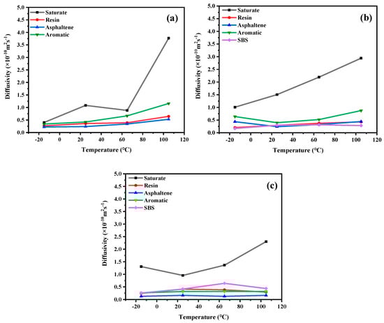 As can be seen from Figure 10a, the order of the diffusivity of the four components of asphalt at the same temperature was asphaltenes < resins < aromatics < saturates. This was contrary to the order of the molecular weight of asphalt components. Among them, the diffusion rate of saturates were found to be the highest and most affected by temperature, especially at temperatures above 65 °C. This was mainly because the diffusion rates of the four components of asphalt were strongly and negatively related to their molecular weight.