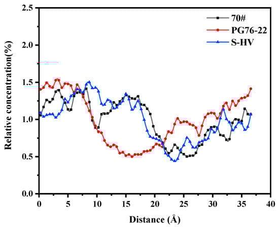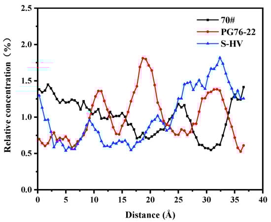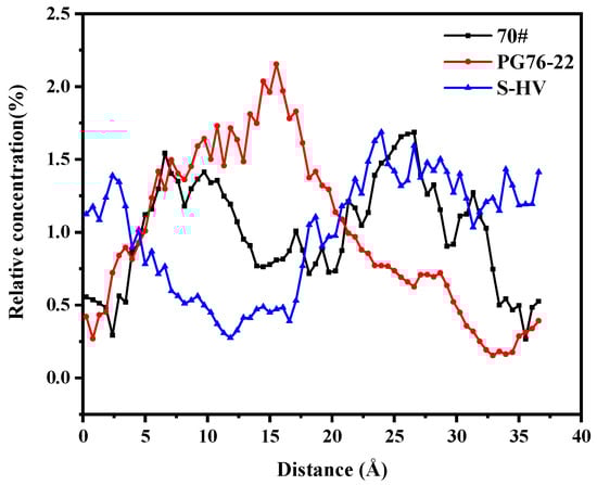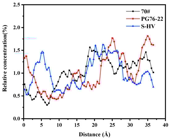 As shown in Figure 14, the solubility of asphaltenes in PG76-22 modified asphalt had the greatest difference from those of S-HV and PG76 modified asphalts. The maximum value of asphaltenes appeared in the range of 15 Å to 20 Å and the solubility of asphaltenes at both ends was low, indicating that asphaltenes presented aggregation behavior in the middle. Relatively speaking, the distribution of asphaltenes in 70# and S-HV modified asphalts was more uniform.