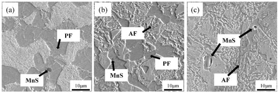 Microstructure and mechanical properties of materials are closely related. In the traditional metallurgical field, the influence of inclusions on steel is complex; it is well known that large nonmetallic inclusions are harmful to the mechanical properties of steel because they act as nucleation sites for pores and cracks during deformation and service, thereby becoming the source of cracks [6]. However, in HLSA steel, a large number of fine carbonitride precipitates play an important role in grain refinement and acicular ferrite (AF) transformation. In the field of welding, several studies have confirmed that AF structure is important for improving mechanical properties and impact toughness [7,8,9]. For studies on nonmetallic inclusions, the main experimental objects are oxides [10,11] and Ti-rich inclusions [12,13] such as Ti2O3, TiN, and MnS [14,15,16,17]. In a study by J M Dowling [18] et al., it was indicated that any inclusions surface can assist ferrite nucleation via simple heterogeneous nucleation The main mechanisms of AF nucleation are minimum mismatch mechanism [19], Mn-poor region mechanism [12,20], stress–strain energy mechanism, and inert interface energy mechanism [21]. It is widely accepted that AF refines grains, which improve mechanical properties. When a material receives external load impact, crack propagation deflects when it encounters AF, which consumes energy. The phase transformation process can be observed better by using updated equipment such as a high-temperature in situ confocal microscope [22,23,24,25]. Undercooled austenite transforms into polygonal ferrite (PF) and acicular ferrite (AF), granular bainite (GB) and lath bainite (LB), and Martensite (M) under different cooling conditions; however, most studies have focused on the welding thermal cycle. Complex microstructures can be obtained by the phase transformation of different cooling paths at an intermediate temperature. There are few studies [4,9,21] on the isothermal transformation process at an intermediate temperature and the influence of different multiphase structures on the impact toughness. In a study by Li [13] et al., it was shown that small inclusions of 2–4 microns increased the possibility of AF nucleation. Additionally, we concluded that larger MnS can also be used as a matrix for AF nucleation.