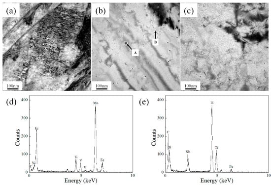 Figure 2 shows the microstructure of continuous cooling. Figure 2a shows that acicular ferrite presents a substructure similar to that of lath or acicular band. A large number of high-density dislocations were found in acicular ferrite. Figure 2b,c show the precipitation of ferrite at cooling rates of 0.1 °C/s and 1 °C/s, respectively. Through the energy spectrum measurements of precipitates with different sizes, the NbCN precipitates with a large size of approximately 38 nm at position A and VCN precipitates at position B can be obtained.