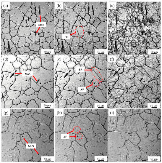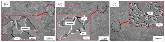 Figure 3 shows the in situ observations of tissues during different isothermal heat treatment processes. It can be observed from the diagram that there are two kinds of precipitates in the sample: (1) one precipitate has a large number of nm precipitation, and the TiN distribution displays a very uniform dispersion and (2) the other precipitate is a short rod-like MnS with a length of approximately 3 to 50 microns. Both precipitates can effectively limit the movement of austenite grain boundaries during heating. It can be observed in Figure 3b that when the isothermal temperature is 650 °C, austenite first transforms into PF, and then the remaining untransformed austenite continues to undergo pearlite transformation, as shown in Figure 2c. When the isothermal temperature drops to 600 °C, the transformation of austenite to PF and AF occurs. PF nucleation on the grain boundary and AF nucleation on the inclusions in the austenite grain have no P transformation. The normal growth of AF is random. When the isothermal temperature continues to drop to 550 °C, almost only austenite transforms to acicular ferrite during the isothermal process, and AF in different directions collide.