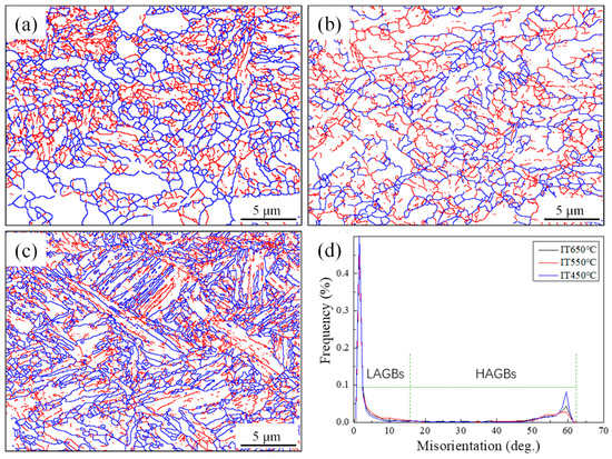 EBSD analysis of microstructure corresponding to isothermal temperatures of (a) 650 °C; (b) 600 °C; (c) 550 °C; (d) grain boundary misorientation distribution (blue lines denote the angles >15° and red lines denote the angle between 2 and 15°).