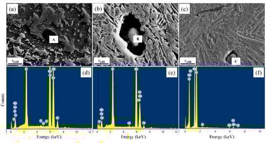 SEM micrographs and EDX spectra of typical nonmetallic inclusions: (a) MnS-Ti2O3; (b) MnS; (c) MnS-Al2O3; (d) EDX spectrum at position A; (e) EDX spectrum at position B; (f) EDX spectrum at position C.