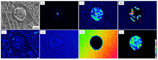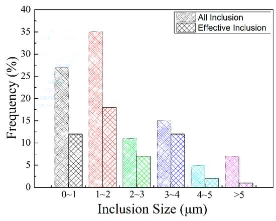 Through the statistical analysis of the size distribution, the relative AF nucleating agent in steel is superimposed on the size distribution of all inclusions, as shown in Figure 11. When the sample is cooled, the elements, after diffusion and solid solution, reaggregate to form new inclusions. The basis of inclusion nucleation can be revealed by the Ostwald process. Ostwald quantified precisely that small particles have a higher solubility than larger particles; with decreasing temperature, the surface energy increases and the solubility of the particles increases. The largest number of inclusions in the steel is 1~2 microns, accounting for 35.1%; the second largest number of inclusions in the steel is 0~1 micron, accounting for 26.8%; the least number of inclusions are 4~5 microns and greater than 5 microns accounted for 5.4% and 6.8%, respectively. It can be concluded from the statistical analysis that when the size of inclusions is in the range of 3–4 microns, it accounts for 15.3% of the total. Among them, 12.7% of the inclusions become the nucleation particles of acicular ferrite, and the nucleation rate reaches 83%. According to the EDX spectrum results of inclusions in Figure 6, it can be seen that it is not easy for pure MnS inclusions to form AF nucleation particles. Inclusions with multiple types of inclusions, such as MnS-Ti2O3, MnS-Al2O3, and (Ti-Mn-O) + (Al + Si + Mn-O) + MnS with more complex structures shown in Figure 8, can better promote AF nucleation. It is inferred that this is the result of multiple mechanisms that promote ferrite nucleation. The lattice mismatch between TiN and ferrite is small, which reduces the activation energy barrier of ferrite nucleation. The results obtained from the J. M. Dowling study show that any inclusion surface can help ferrite nucleation through simple heterogeneous nucleation [18]. In the study of inclusions promoting nucleation with large size, it was found in the EPMA element surface scanning results that due to the formation of MnS, Mn elements in the local area formed a poor area. It is well known that Mn is the element of stable austenite, and the area lacking Mn also increases the chemical driving force of ferrite nucleation; therefore, it is more prone to ferrite transformation.
