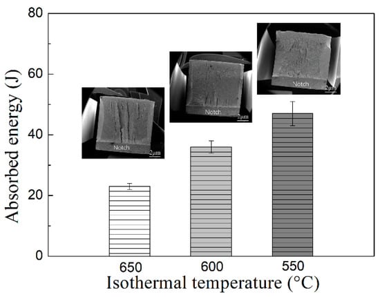 Figure 8 shows the impact energy and corresponding macroscopic fracture morphology of CVN samples at different isothermal temperatures. The average impact energy is 23 ± 1 J after isothermal heat treatment at 650 °C. With a decrease in isothermal temperature from 650 to 600 °C, the toughness increases by approximately 56% (36 ± 2 J). When the isothermal temperature continues to decrease to 550 °C, the toughness increases by approximately 104% (47 ± 4 J). The characteristic of quasi-cleavage fracture can be observed in the fracture surface, as shown in Figure 8. The number of cracks increases, and the surface becomes flatter with decreasing isothermal temperature; additionally, the area of ductile fracture zone increases. In order to study the improvement effect of acicular ferrite on impact properties in detail, the fracture morphology and SEM micrographs perpendicular to the fracture morphology of the samples at 600 and 550 °C are shown in Figure 9. Under the isothermal process at 600 °C, the microstructure is composed of polygonal ferrite, acicular ferrite, and bainite. The ferrite and bainite phases coordinately deform during plastic deformation, forming a certain number of micropores during necking fracture, but the number of micropores is small and the size is small, as shown in Figure 9.