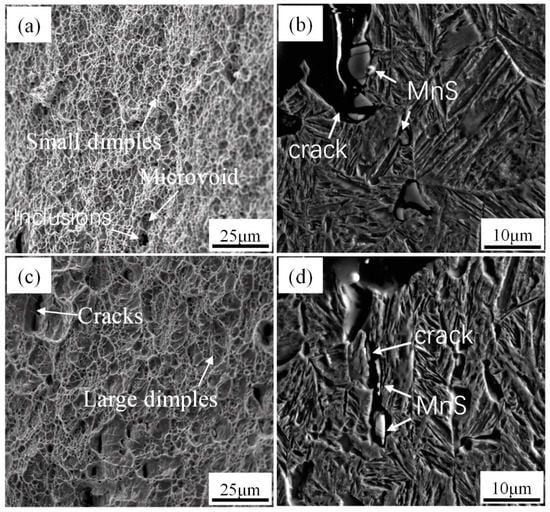 When the isothermal temperature is 550 °C, the microstructure is composed of acicular ferrite and bainite. The acicular ferrite has a significant influence on impact toughness, because its fine grain size and the interlocking structure of large-angle boundary hinder the crack propagation. It can be seen from the EBSD crystal orientation diagram in Figure 5 that the proportion of large-angle grain boundary after the isothermal temperature decreases from 600 to 550 °C is 26.29% and 31.36%, respectively, and together with effective grain refinement led to increased toughness. When the specimen is deformed under an external load, the failure mainly originates from the microstructure, such as vacancy, dislocation, grain boundary, and micro crack. Inclusion MnS is an important cause of crack source [29]. Gao [30] et al. studied micro crack propagation and connectivity of ductile materials and showed that AF had higher requirements for crack initiation and propagation, and larger ductile fracture area. When the sample received plastic deformation, the cleavage crack was deflected by AF crystal orientation, so that the toughness improvement effect was greater than that of grain refinement.