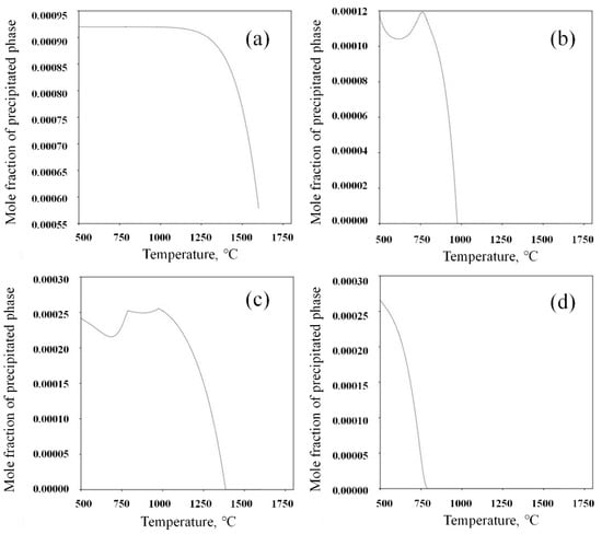 Calculated equilibrium mole fractions of precipitated phases in steels: (a) MnS; (b) NbCN; (c) TiN; (d) VCN.