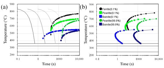 Phase transformation curves: (a) CCT; (b) TTT, with Jmat-Pro calculated steel.