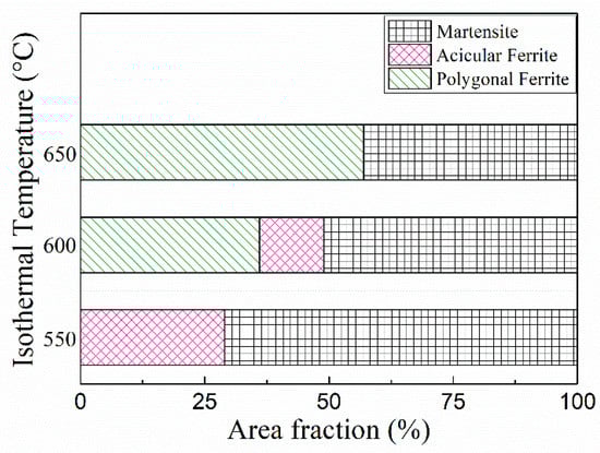 During the cooling process, as the carbon atom diffuses from the ferrite into an austenite, the carbon atom is proliferated from the austenite that is converted from the ferrite, and the carbonaceous bone has increased stability. At the end of the isothermal process, the acicular ferrite transformation is completed. As the cooling rate in this experiment is small, the austenite continues to transform into bainite, and martensite transformation cannot occur. However, due to the existence of carbon-rich austenite, the final M/A structure is formed. According to the statistical results of area fraction of microstructure components at different isothermal temperatures in Figure 14, when the isothermal temperature is at 650 °C, the proportion of PF transformation is approximately 57%, and the remaining 43% is B. When the isothermal temperature decreases to 600 °C, the proportion of PF decreases approximately 36%, AF transformation is 13%, and the remaining 51% is B. When the isothermal temperature continues to decrease to 550 °C, almost no PF is found. The AF content continues to increase to 29%, and the remaining B accounts for approximately 71%.