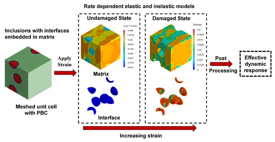 The meshed RVEs are subjected to compressive strain at a strain rate of 200/s. This enables the framework to emulate displacement control during experimental loading. The response of the homogenized composite at the pre-peak regime is dominantly characterized by the dynamic modulus of the matrix, which is a function of strain rate expressed as [54]