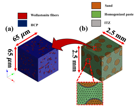 The two scales in the study correspond to that of the paste scale and, subsequently, the mortar scale, as shown in Figure 2. Figure 2 shows the two length scales for a representative mortar with a 10% wollastonite fiber. The wollastonite fibers have an average size of 4 µm [41]. The average length of the fibers is 12 µm with an aspect ratio of three. For sand inclusions, the median size of the sand is 600 µm, adopted after [32]. The homogenization algorithm is applied both at the cement paste scale and the mortar scale to ascertain the homogenized stress–strain response. In the cement paste scale (Figure 2a), the fibers are, first, homogenized with the hardened cement paste (HCP) matrix. The effective behavior thus obtained corresponds to wollastonite-reinforced pastes. The choice of unit cell size and the mesh convergence are provided in the Supplementary Materials, Section A.