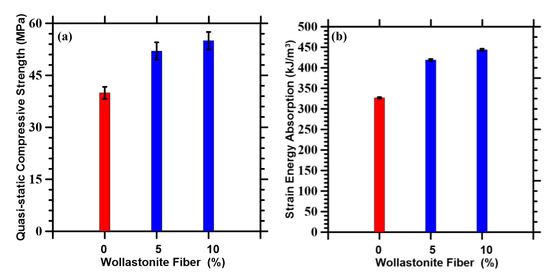 (a) Quasi-static compressive strengths and (b) strain energy absorption of control (shown in red) and wollastonite fiber-reinforced mortars (shown in blue).