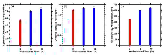 Dynamic properties: (a) compressive strength, (b) dynamic increase factor, and (c) strain energy absorption for varying wollastonite content at a strain rate of 200/s.