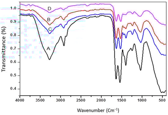 FTIR spectra: (A) ACDB before adsorption; (B): ACDB after adsorption; (C) LFB before adsorption; (D) LFB after adsorption.