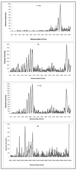 Raman spectrum for spectra for: ACDB before adsorption (a); ACDB after adsorption (b); LFB before adsorption (c); LFB after adsorption of IV2R dye (d).