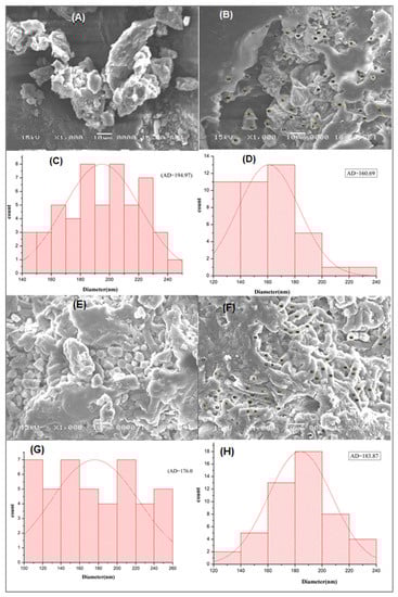 SEM pictures of ACDB before adsorption (A), after adsorption (B), and LFB before adsorption (E); LFB after adsorption (F), and the corresponding diameter distributions of (C,D,G, and H, respectively).
