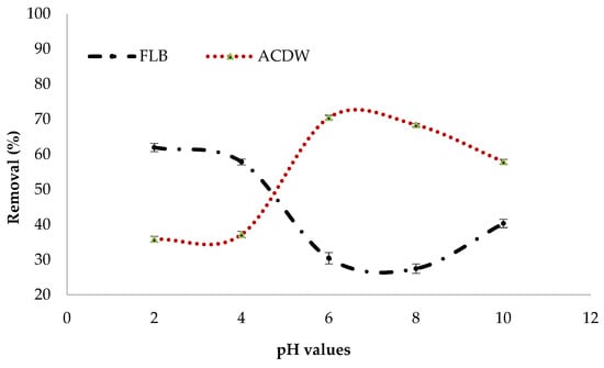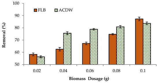 The influence of ACDB and LFB dosage (liquid to solid ratio) on color elimination of the IV2R dye under different biomass dosages was examined (Figure 4). The results showed that the color of dye augmented with the dosage increased from 0.02 to 0.1 g L−1 of adsorbent amounts. The percentages of IV2R removal by ACDW adsorbent increased from 56.3 to 84.13%, while using LFB enhanced the removal from 58 to 87.2% using 0.02 g to 0.1 g, respectively. This may be due to a greater availability of surface area or the exchangeable sites at a higher quantity of adsorbent dosage for the complexation of dye ions. In the same way, reduced dye removal is described at very high adsorbent doses owing to incomplete aggregation of adsorbents, in addition to a reduction in the average distance among obtainable adsorption sites [28]. Furthermore, electrostatic interactions between cells could be a major factor in the uptake of biomass-dependent dyes. If the distance between the cells is greater, a huge amount of dye ions is biosorbed; otherwise, a small amount of adsorbent is utilized, which is sufficient for sorption to occur [40]. Even though an increased adsorbent dose has a reducing role on the sorption capacity of a desorbent. Algae have a high surface area and a high binding affinity during biosorption, which increases their adsorption capacity [41]. The algal cell surface contains functional groups such as hydroxyl, carboxylate, amino, and phosphate, which are responsible for the removal of pollutants from wastewater [26].
