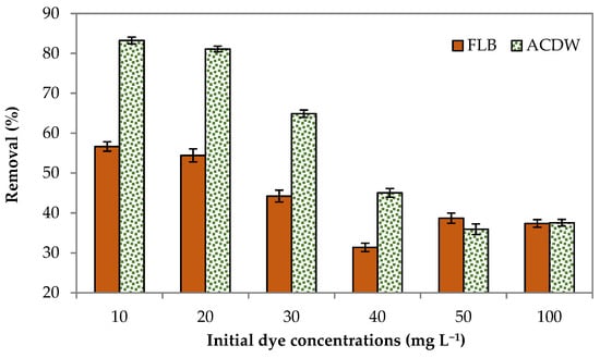 The results of the effect of initial concentrations of dye on the sorption uptake of IV2R are shown in Figure 5. Six initial dye concentrations (10, 20, 30, 40, 50, and 100 mg L−1) were used at a constant adsorbent amount of 0.04 g for 2 h at room temperature. As Ismate violet 2R adsorbed relatively well on this medium with a contact time of 120 min, which corresponds to removal rates of 83.3 and 56.4% for ACDB and LFB, respectively, the initial concentration of 10 mg L−1 IV2R dye was selected to be used in real wastewater. The number of functional groups available reduced as the initial dye concentration increased. The percentage uptake of dye reduced from 83.3% to 37% and 56.4% to 36.9 1% by augmentation of the dye concentration from 10 to 100 mg L−1, for ACDB and LFB, respectively. It has been found that the adsorption rate of IV2R dye is high at the beginning then reduces gradually until the saturation stages were wholly reached after a definite concentration of dye for both the adsorbent biomasses. The number of accessible functional groups reduces as the initial dye concentration increases, as seen by the decrease in percentage sorption as the initial dye ions concentrations increase, due to the fact that the amount of sorbed dye increases in the meantime [8]. This behavior may be due to the fact that at lower concentrations there were sufficient active adsorbent sites for adsorption of presently available dye molecules, but at higher concentrations, due to the inadequate ratio of active sites with dye molecules, adsorption is less [42].
