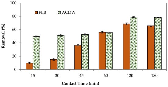 To assess the optimum contact time requisite to reach the equilibrium state among the liquid phase (effluent) and the solid phase (biomass), this experiment was performed. Figure 6 shows the adsorption removal at different contact adsorption times for the two studied adsorbents. Both the ACDB and LFB adsorbents showed that the percentage removal increased with contact time, and after a certain time, no more dye could be removed from the aqueous solution. The maximum adsorption and equilibrium contact times occurred at 120 min with a percentage removal of 78.9% and 68.26%. This is because there are limited adsorbent sites on the adsorbent and the rate of dye binding with biomass is more predominant during the initial stages; after a definite time, these were exhausted and the adsorption process reached a state of equilibrium and gradually decreased [43].