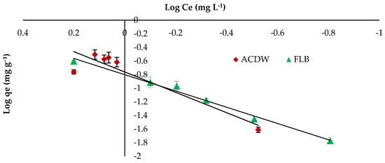 Freundlich constants Kf and n have been determined by the isotherm equation according to Equation (5).
