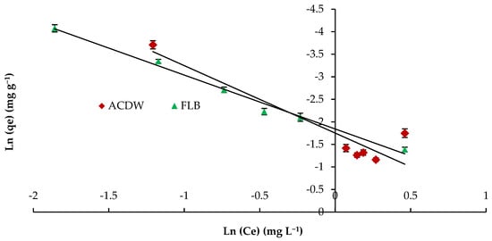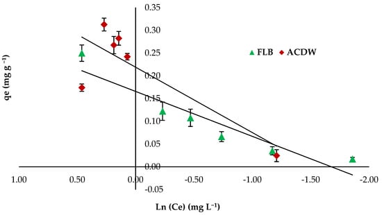 where: B = RT/b, A shows the equilibrium binding constant (Lg−1) correlated to the higher binding energy, b (J mol−1) is a constant corresponding to heat of adsorption, while B = (RT/b) (J mol−1) is the Tempkin constant and the heat of the sorption process, R is the gas constant (8.314 J mol−1 K), and T is the absolute temperature (Kelvin). The sorption results can be analyzed according to Tempkin Equation (6). Therefore, a plot curve of qe vs. ln Ce allows the examination of the Tempkin isotherm constants A and B from the slope and intercept.