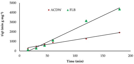 Pseudo-second kinetics of IV2R dyes onto ACDB and LFB.