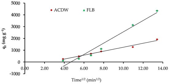 where: C is the intercept; in addition, Kdif (mg g−1 min−0.5) reflects the intraparticle diffusion rate constant.