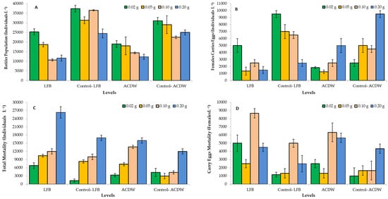 Marine Rotifera, B. plicatilis, is a zooplankton that is extensively utilized as live feed for larvae in aquatic hatcheries [22,64]. Interestingly, rotifer (Brachionus plicatilis) is one of the most extensively aquatic animals utilized in environmental toxicity studies due to it being easy to keep in the laboratory and that it can be preserved at high population densities in minor volumes, has a short life cycle, and that it is a good indicator of heavy metal pollution [65]. In the current study, Figure 14A–D shows the rotifer population, rotifer mortality, female carry eggs population, and the mortality of female carry eggs, respectively.