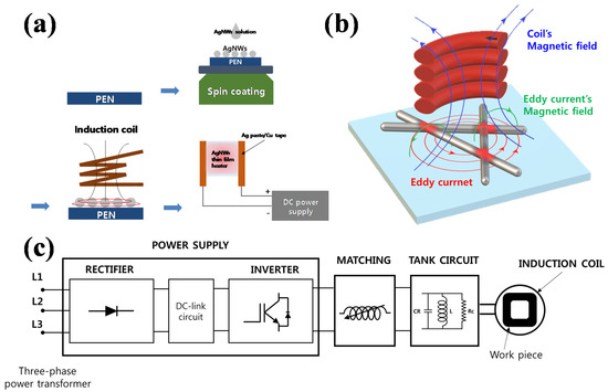 To improve the electrical and mechanical characteristics of the transparent electrode using Ag NWs, the welding process is necessary to enhance their performance. Ag NW welding using various methods has been investigated, such as heating, plasmonic effect, capillary force, chemical treatment, laser irradiation, and radiofrequency [27,28,29,30,31,32,33,34,35,36]. The welding treatment can significantly reduce the contact resistance of the Ag NWs. Among these methods, induction welding using radiofrequency has additional advantages, because it can heat and weld only the junction area through the eddy current induced on the Ag NWs by the electromagnetic field generated by rf power, and it is a self-terminating process, where when the welding process is complete, the welding stops itself [37,38,39,40,41].