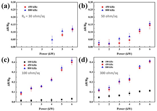 Change of Ag NWs sheet resistance by the welding with different frequencies of 100, 450, and 800 kHz and with 1–6 kW power for 60 s for the Ag NW networks with the initial sheet resistances of (a) 30, (b) 50, (c) 100, and (d) 300 ohm/sq.