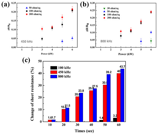 Figure 2c,d show that the differences in sheet resistance change of Ag NW networks between 450 and 800 kHz are not significant, even though they are significantly different from those welded at 100 kHz. Therefore, to confirm the difference between the two frequencies, the induction heating for 30 s with the power of 1–6 kW using 450 and 800 kHz was also investigated, and Figure 3a,b show the respective results. As shown in Figure 3a, even when 6 kW was applied at the frequency of 450 kHz, there was no change of resistance in the 30 ohm/sq Ag NW network. However, the resistance change could be observed for the Ag NW network with the initial resistance of 50 ohm/sq or higher. When 6 kW power was applied for 30 s, the resistance change was ~5% for the 50 ohm/sq Ag NW network, ~20.8% for the 100 ohm/sq Ag NW network, and ~21.5% for the 300 ohm/sq Ag NW network. In contrast, Figure 3b shows that at 800 kHz frequency and 6 kW, the resistance change of ~4.4% was observed for the initial resistance of 30 ohm/sq Ag NW networks, and the sheet resistance change of ~23.8 and ~24.1% for the 100 and 300 ohm/sq, respectively, could be observed. Figure 3c compares the changes in sheet resistance of 100 ohm/sq Ag NW networks as a function of welding time from 10 to 60 s at 6 kW for different frequencies. Although after the welding, a change in sheet resistance is seen at all frequencies, the effect is negligible at 100 kHz, and the rate of resistance change increased with increasing frequency.