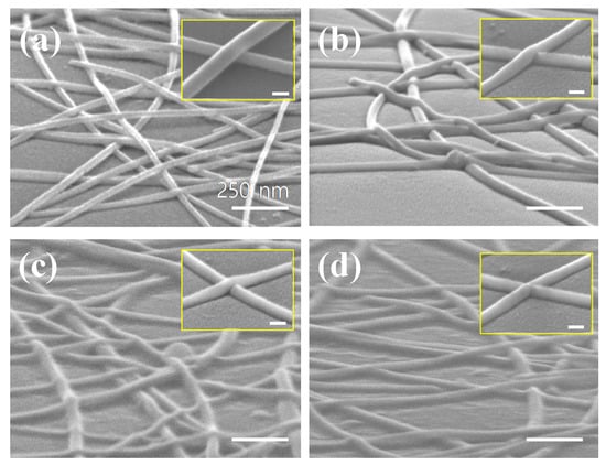 SEM image of the 100 ohm/sq Ag NW networks after inductive welding. (a) After the coating on the PEN substrate without welding; (b) after welding at 100 kHz; (c) after welding at 450 kHz; and (d) after welding at 800 kHz at 6 kW for 60 s. All of inset images are the morphology of nanowire junctions (scale bar: 30 nm).